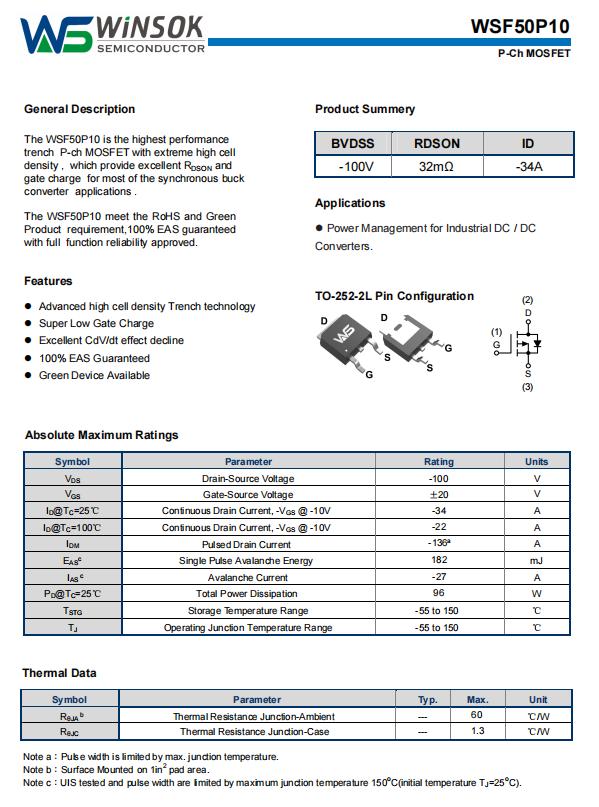 WSF50P10作为微硕WINSOK高性能P沟道集成MOS管,其技术参数完美满足车前灯核心驱动需求: